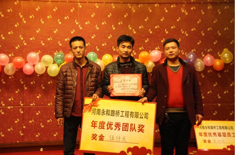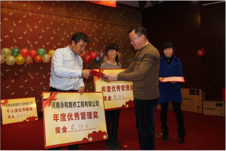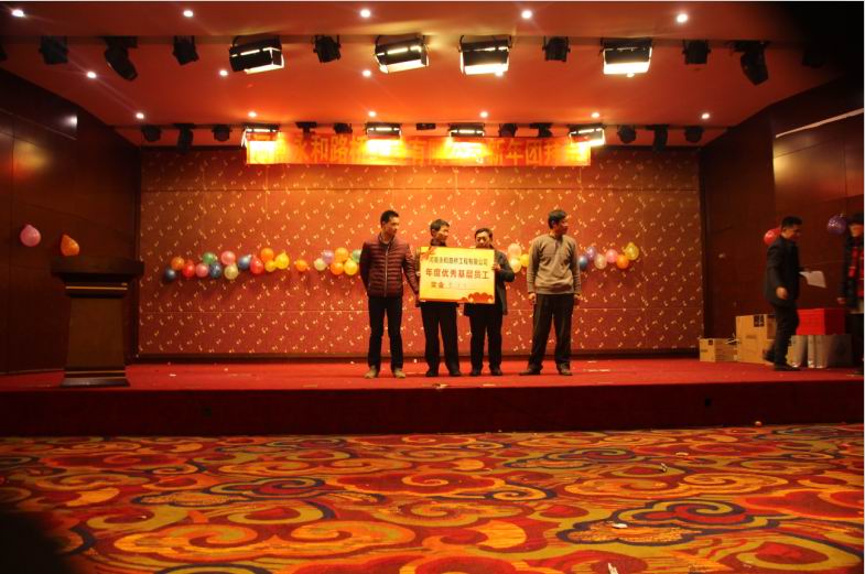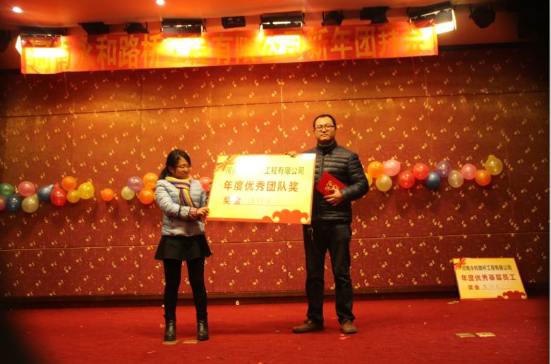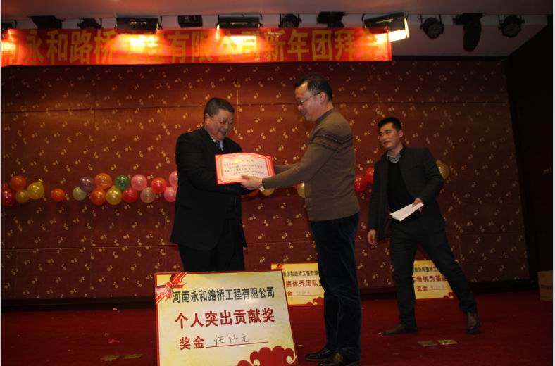 2016年2月4日晚,農(nóng)歷臘月26日晚,河南永和路橋工程有限公司在信陽市五星 級(jí)酒店中樂百花酒店隆重的舉行了2016年新春團(tuán)拜會(huì),本次團(tuán)拜會(huì)由公司全體員工及家屬、公司的合作伙伴、朋友等共同出席,大家歡聚一堂、把酒言歡、其樂融融。公司董事長(zhǎng)孔總發(fā)表新年賀詞比代表公司對(duì)年度優(yōu) 秀個(gè)人及團(tuán)隊(duì)進(jìn)行了表彰。公司還為到場(chǎng)的每位小寶寶送上新年祝福和紅包,并準(zhǔn)備了抽獎(jiǎng)環(huán)節(jié)。大家歡歌笑語,一直將熱鬧、愉快的氛圍維持到午夜。圖為團(tuán)拜會(huì)期間頒獎(jiǎng)儀式
