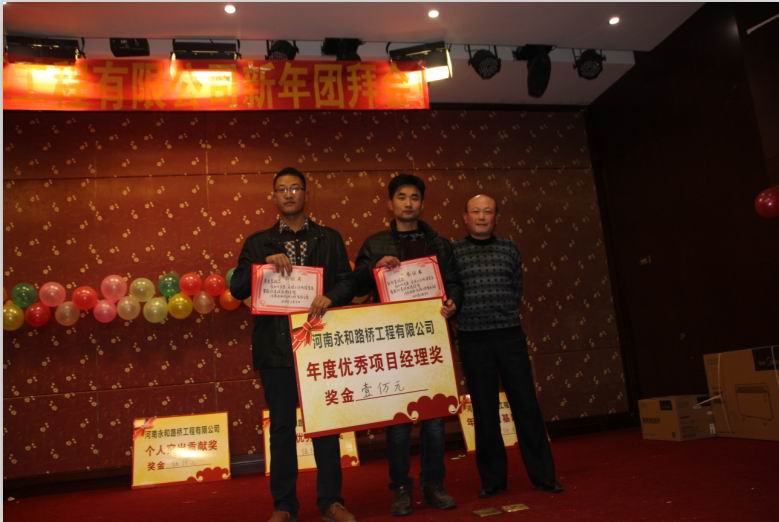 2016年2月4日晚,農(nóng)歷臘月26日晚,河南永和路橋工程有限公司在信陽市五星 級酒店中樂百花酒店隆重的舉行了2016年新春團拜會,本次團拜會由公司全體員工及家屬、公司的合作伙伴、朋友等共同出席,大家歡聚一堂、把酒言歡、其樂融融。公司董事長孔總發(fā)表新年賀詞比代表公司對年度優(yōu) 秀個人及團隊進行了表彰。公司還為到場的每位小寶寶送上新年祝福和紅包,并準備了抽獎環(huán)節(jié)。大家歡歌笑語,一直將熱鬧、愉快的氛圍維持到午夜。圖為團拜會期間頒獎儀式